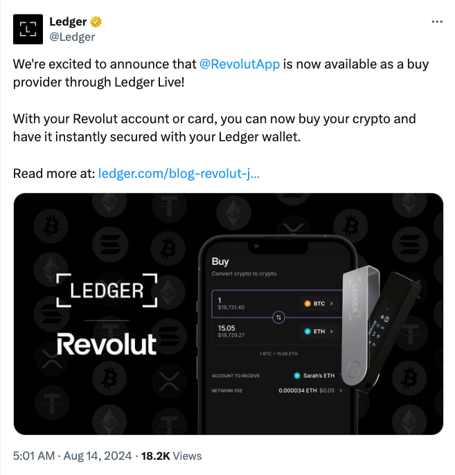 Revolut и Ledger совместно объявили о новом партнерстве 14 августа. Цель партнерства — позволить клиентам Ledger покупать и продавать криптовалюты, такие как биткоины (BTC), через сервис Revolut Ramp.
