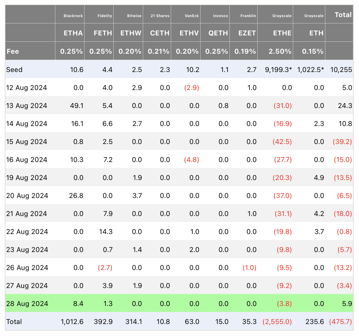 Grayscale Ethereum Trust (ETHE) все еще остается в минусе с оттоком $3,8 млн. Но настоящими звездами дня стали BlackRock и Fidelity. ETF от BlackRock привлек $8,4 млн, а FETH от Fidelity — $1,3 млн. Похоже, что крупные игроки финансового рынка начинают переманивать инвесторов у старожила индустрии Grayscale.