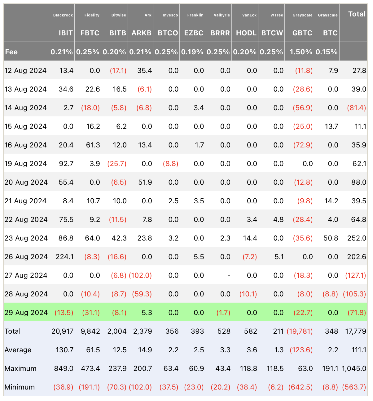 29 августа биткоин-ETF от BlackRock — iShares Bitcoin Trust (IBIT) — зафиксировал чистый отток средств в размере $13,5 млн. Казалось бы, сумма не такая уж и большая, но это всего лишь второй случай оттока с момента запуска фонда в январе. Первый раз такое произошло 1 мая, когда инвесторы вывели $36,9 млн.
