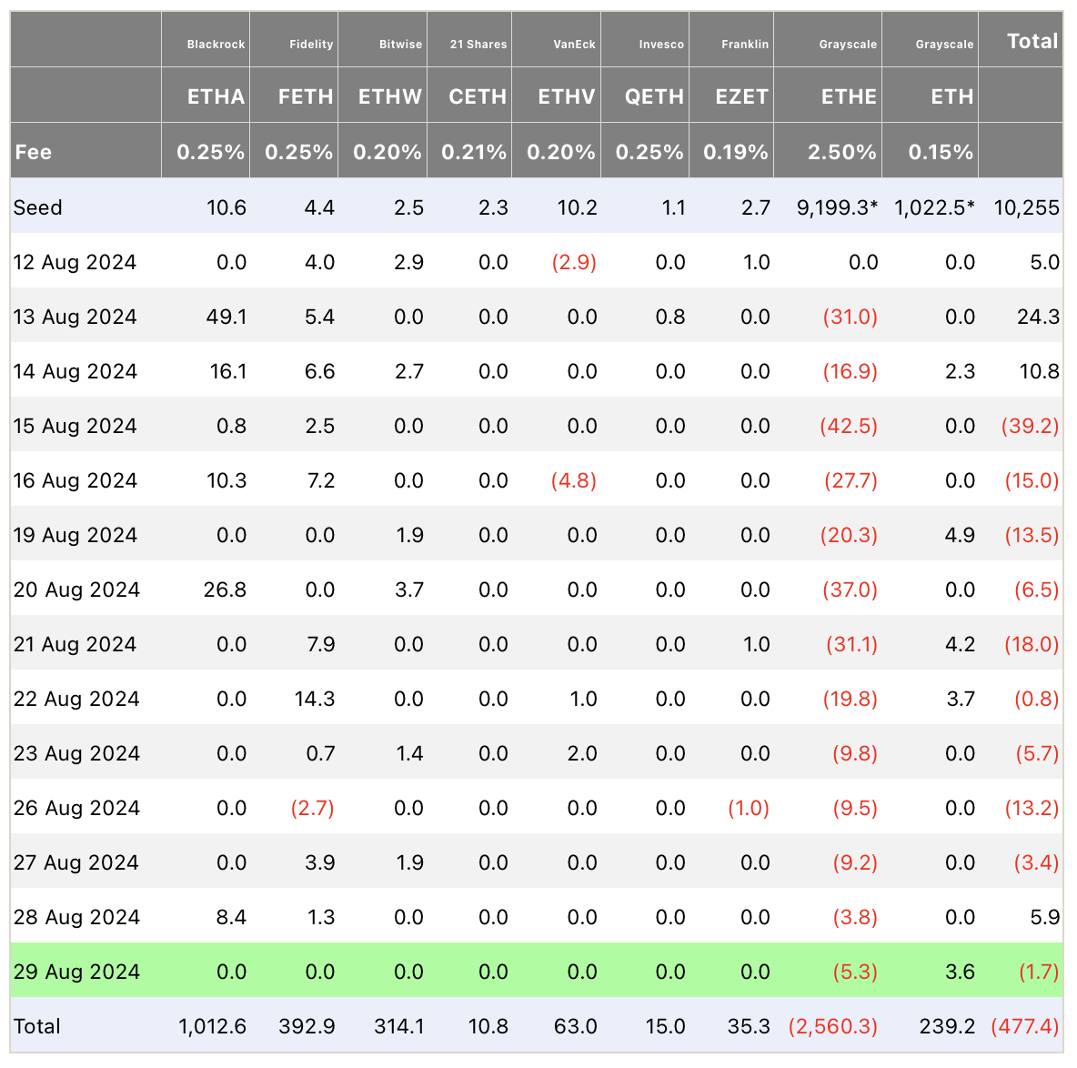 Ethereum-ETF тоже не остались в стороне. 29 августа они показали общий отток в $1,7 млн. Правда, семь из девяти фондов не зафиксировали никакого движения средств. Единственным ETF с притоком стал Grayscale Ethereum Mini Trust (ETH) — $3,6 млн. Но его «старший брат», Grayscale Ethereum Trust (ETHE), потерял $5,3 млн.