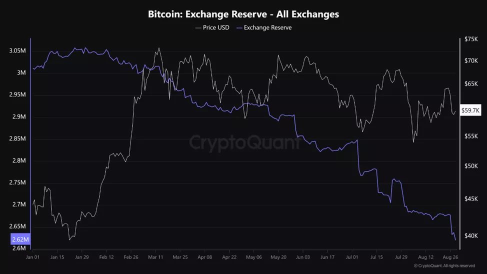 29 августа совокупный баланс биткоинов на централизованных платформах опустился до нового годового минимума. С 1 января метрика уменьшилась на ~12,9%, до 2,62 млн BTC, согласно CryptoQuant.
