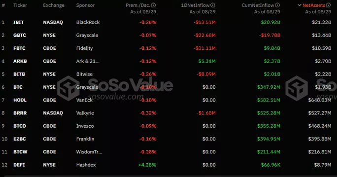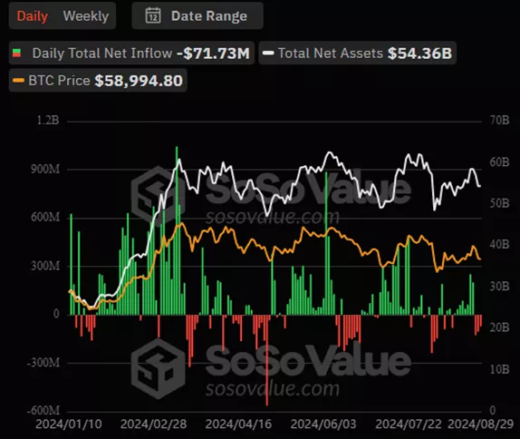 29 августа чистый отток из спотовых биткоин-ETF составил $71,7 млн, согласно SoSoValue. Это стало одной из причин неудачной попытки отыграть часть потерь с начала недели.