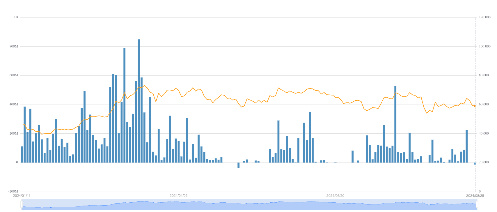 В прошедший торговый день отличился ARK 21Shares Bitcoin ETF (ARKB) — чистый приток в фонд составил $5,3 млн. Тем временем другие фонды, включая Fidelity Bitcoin Trust (FBTC), отчитались о небольших оттоках на общую сумму в $31,1 млн.