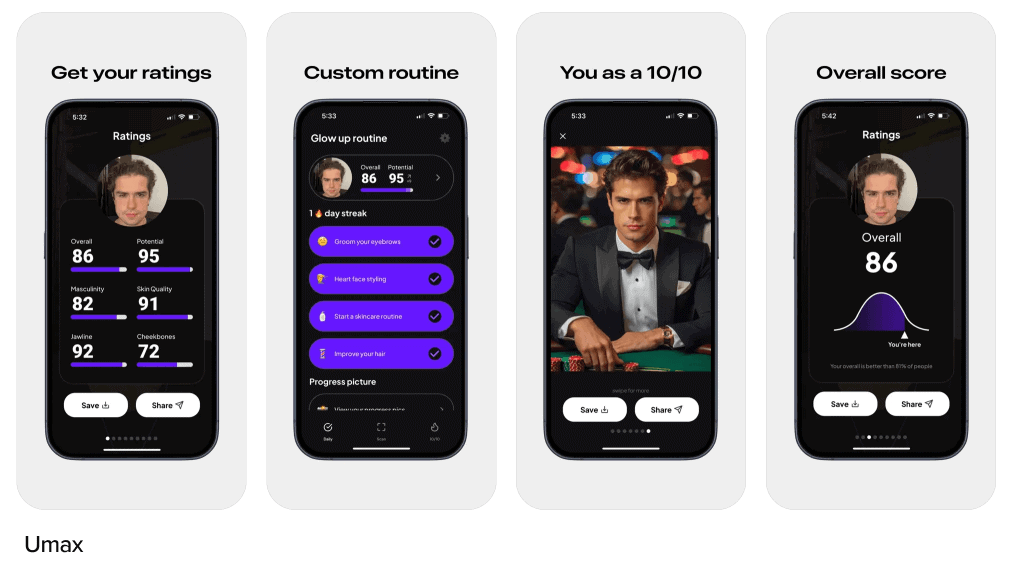 Первые два приложения оценивают фотографии пользователей и дают советы, якобы способные повысить их привлекательность. В случае Umax также доступна генерация изображения, которое, по мнению ИИ, представляет «идеальную» версию внешнего вида пользователя.