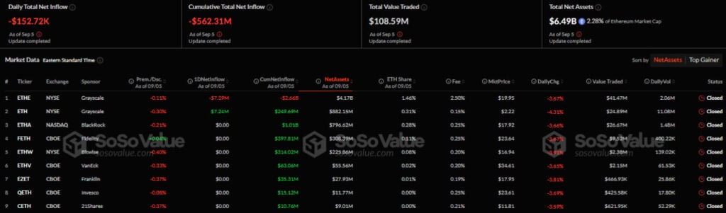 В секторе Ethereum-ETF 5 сентября зафиксировали минимальный отток на $152 720. Фонд ETHE столкнулся с оттоком на $7,39 млн. Другой продукт от компании Grayscale получил приток капитала на $7,24 млн, еще по семи позициям не зафиксировали ни приток, ни отток капитала.