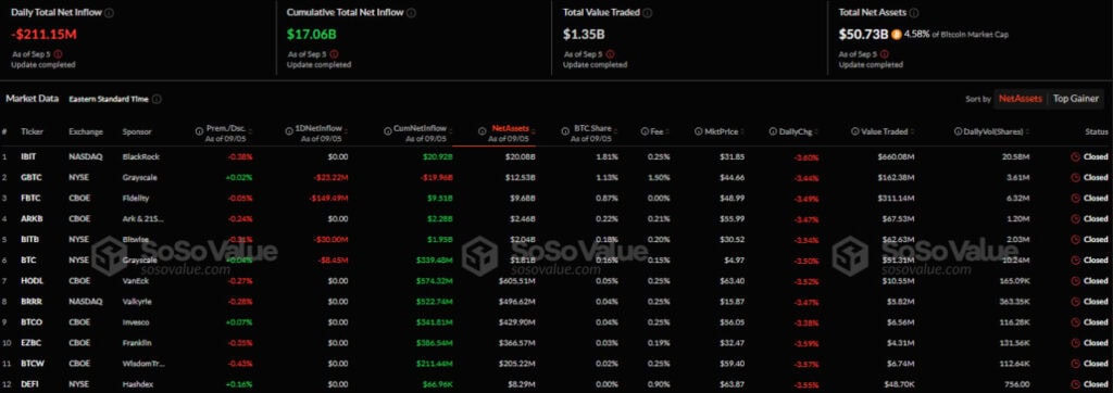 По данным платформы SoSo Value, 4 сентября отток средств получили три биткоин-фонда, а именно: