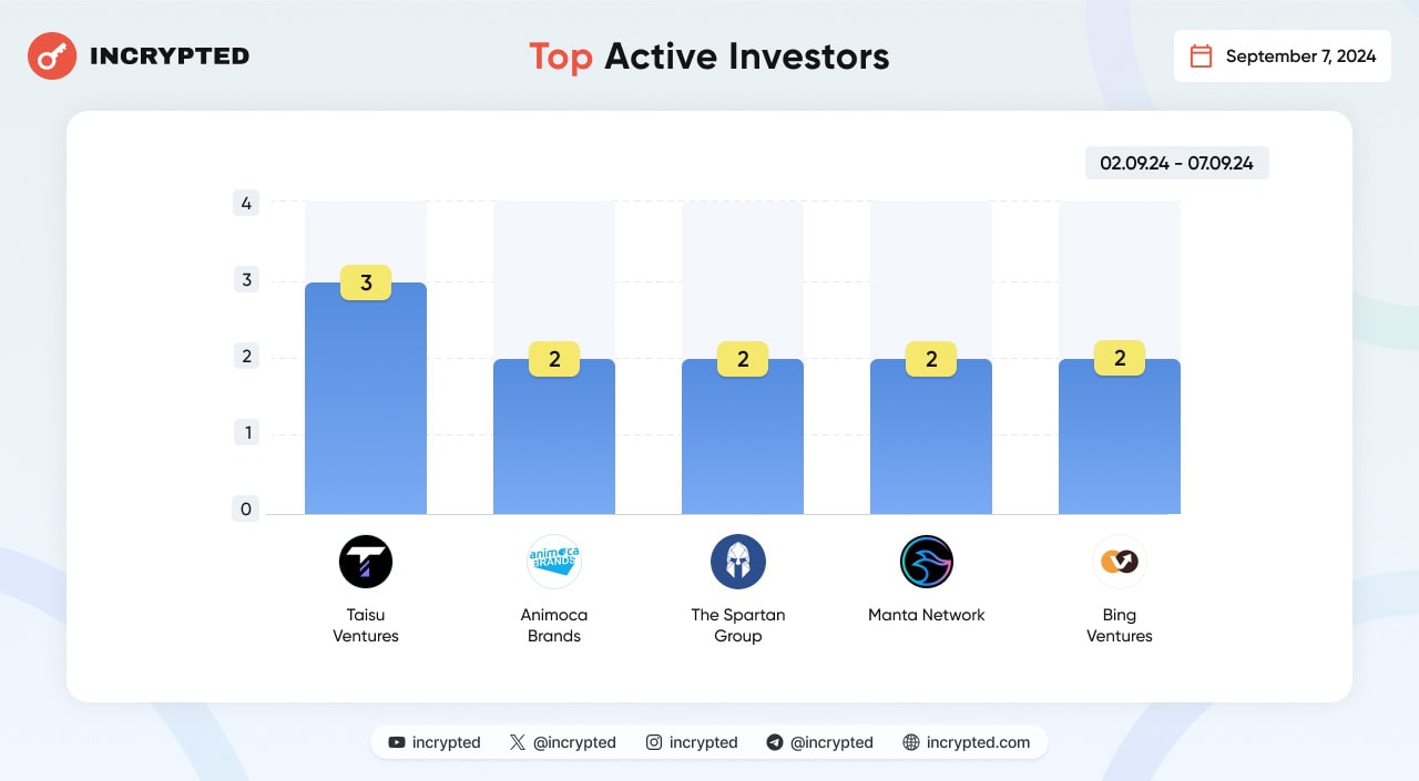 Топ-5 фондов по количеству инвестиций в период с 2 по 7 сентября 2024 года, согласно данным CryptoRank: