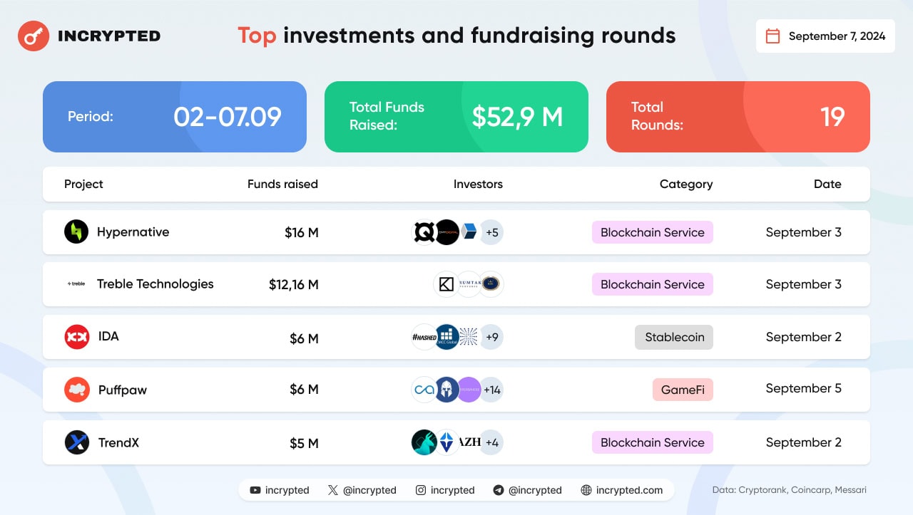 В период со 2 по 7 сентября 2024 года 19 проектов привлекли инвестиции на общую сумму в $52,9 млн. Самые крупные вливания поступили в Hypernative, Treble Technologies и IDA.