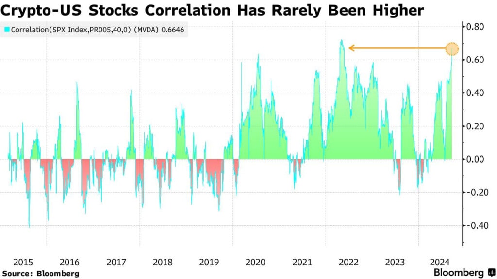 - Коэффициент корреляции криптовалют с акциями США установил максимум с 2022 года
