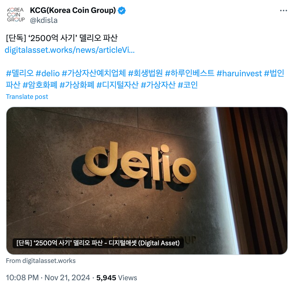 Южнокорейская платформа депозита виртуальных активов Delio была объявлена банкротом судом в Сеуле 22 ноября, согласно многочисленным сообщениям местной прессы.