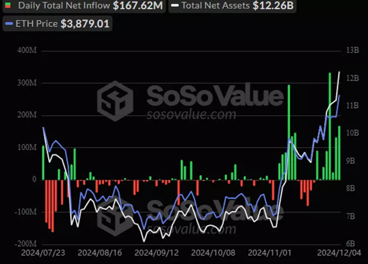 В ETH-ETF поступления составили $167,6 млн. Позитивная динамика продолжилась восьмой день подряд.