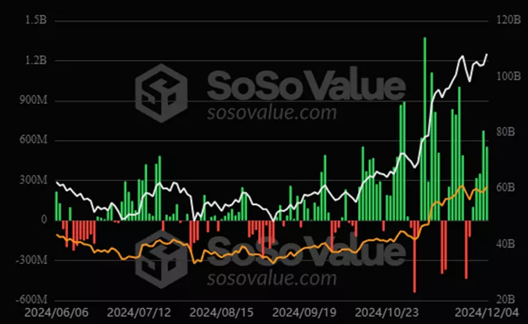 4 декабря поступления в спотовые биткоин-ETF составили $556,82 млн. За последние пять дней инвесторы направили в продукты $2,01 млрд.