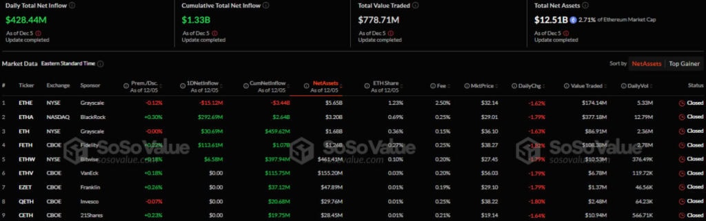 - 5 декабря чистый суточный приток капитала в спотовые Ethereum-ETF обновил исторический максимум.