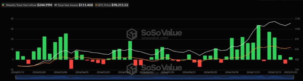 В период с 30 декабря 2024 года по 3 января 2025 года чистый приток капитала в спотовые биткоин-ETF составил $249,99 млн, в Ethereum-ETF зафиксировали отток на сумму $38,20 млн, согласно SoSo Value. Положительная динамика в секторе биткоин-фондов продолжалась два дня в неделе, в продуктах на базе Ethereum аналогичные показатели.