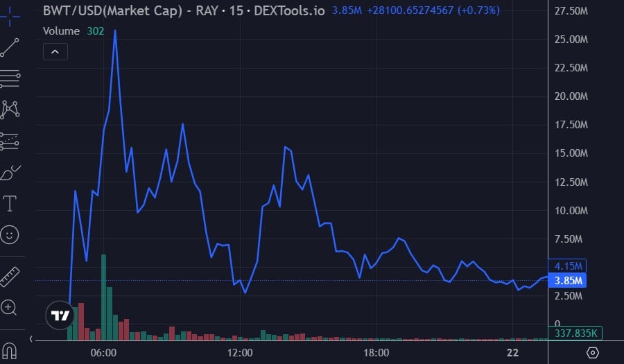 Изменения рыночной капитализации токена BWT, якобы связанного с Бэрроном Трампом