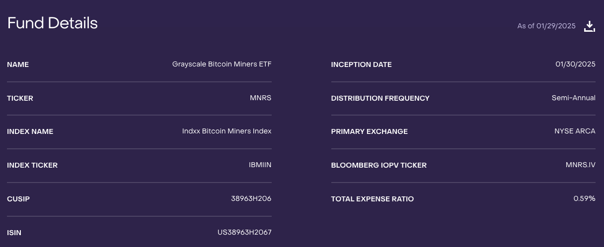 Подробности о Grayscale Bitcoin Miners ETF (MNRS). Источник: Grayscale.
