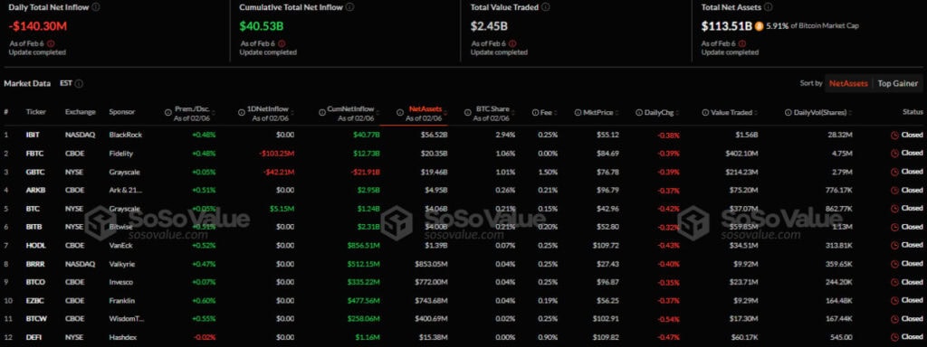 - Отток средств за сутки в биткоин-фондах составил $140,30 млн.