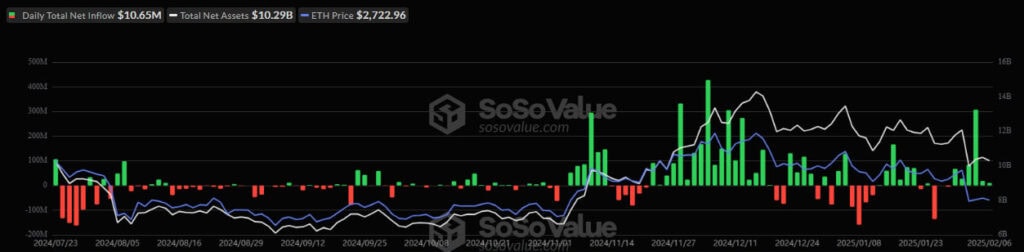 6 февраля 2025 года приток средств в спотовые Ethereum-ETF в США составил $10,65 млн. Положительная динамика в секторе продолжается уже шесть торговых дней подряд, согласно SoSoValue.