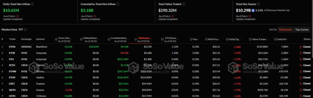 По данным платформы, 6 февраля приток средств получил лишь инвестиционный продукт от компании BlackRock — ETHA.