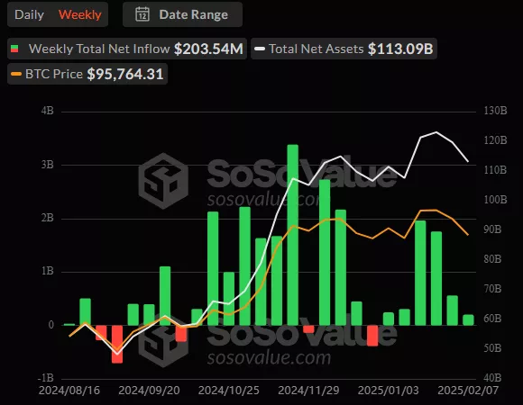 В сегменте американских спотовых биткоин-ETF поступления за неделю составили $203,54 млн. Приток продолжился шестую неделю подряд.