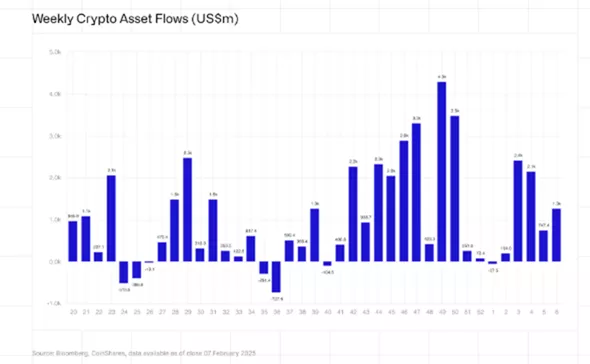 С 1 по 7 февраля в криптовалютные инвестфонды поступило $1,3 млрд после $527 млн в предыдущий отчетный период. Такие данные привели в CoinShares.