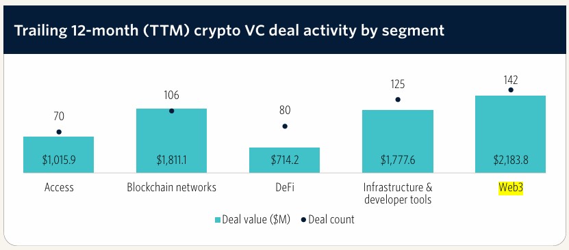 Инфраструктура и инструменты разработчика, включая хранение данных, платформы разработки, институциональные услуги и управление узлами и валидаторами, заняли третье место с 1,7 млрд долларов в 125 сделках.
