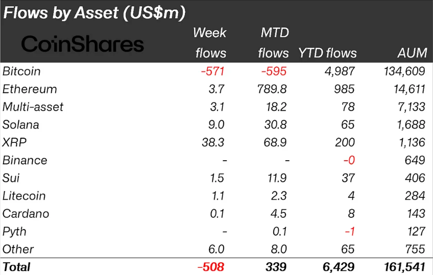По данным CoinShares, биткоин (BTC) показал максимальный отток средств — $571 млн. При этом некоторые трейдеры увеличили короткие позиции, что привело к притоку $2,8 млн в шорт-продукты на биткоин.