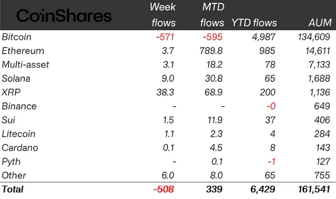 Инвестиционные продукты на основе биткоина понесли наибольшие потери на прошлой неделе, составив $571 млн оттока.