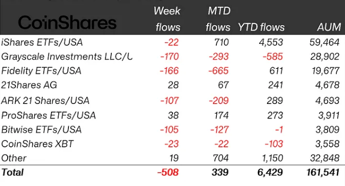 Крипто-ETP увидели отток в размере $508 млн на прошлой торговой неделе после оттока в размере $415 млн на предыдущей неделе, сообщила CoinShares 24 февраля.