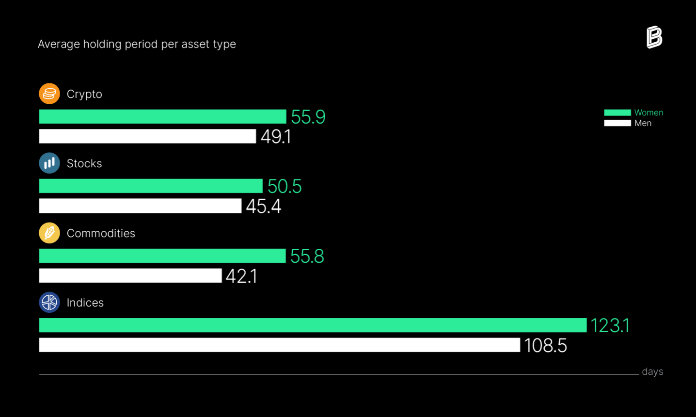 Средний период удержания активов у женщин и мужчин по типу актива. Источник: Bitpanda.