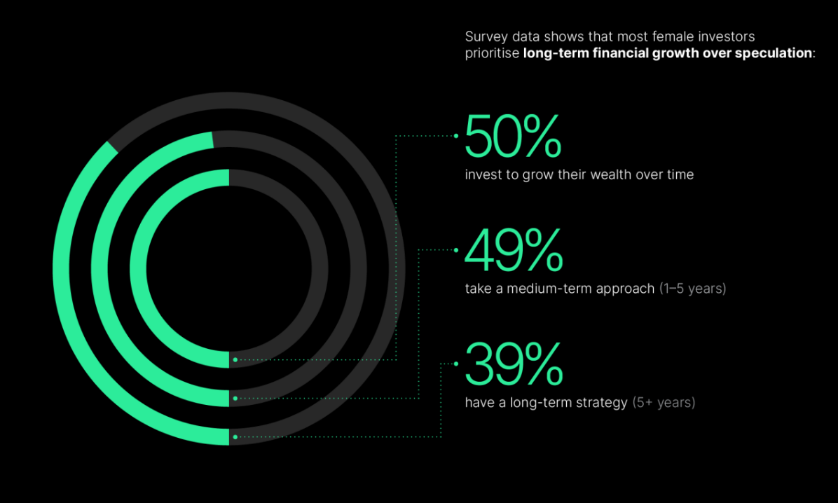 Согласно опросу, 50% женщин-криптоинвесторов отдают приоритет долгосрочному финансовому росту, при этом 49% держат цифровые активы до пяти лет, а 39% планируют держать более пяти лет.