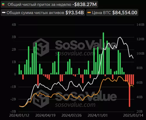 В сегменте американских спотовых биткоин-ETF инвесторы вывели из продуктов $838,3 млн. Негативная динамика продолжилась пятую неделю подряд.