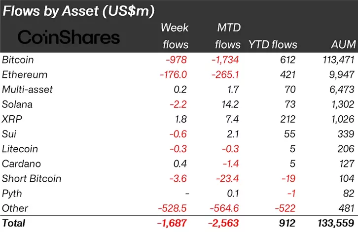 В инструментах на базе первой криптовалюты отток увеличился с $756 млн до $978 млн, за последние пять недель — до $5,4 млрд.
