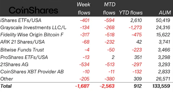 BlackRock, крупнейший держатель криптовалюты среди всех эмитентов, увидел $401 млн оттока, а с начала месяца отток увеличился до $594 млн.