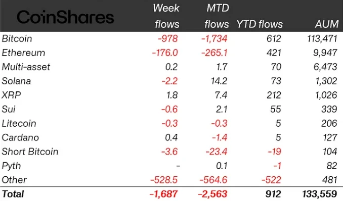 После оттока средств в размере $756 млн в первую неделю марта, Bitcoin ETP продемонстрировали рост продаж в торговую неделю с 10 по 14 марта, что привело к дальнейшему оттоку средств в размере $978 млн.