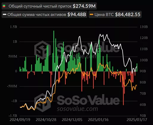 17 марта поступления в спотовые ETF на основе цифрового золота составили $274,59 млн. Столь высокое значение в последний раз наблюдалось по итогам 4 февраля.