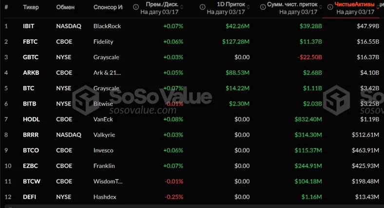 17 марта наибольший вклад в положительную динамику внесли FBTC от Fidelity Investments ($127,3 млн) и ARKB от ARK Invest & 21Shares ($88,5 млн).