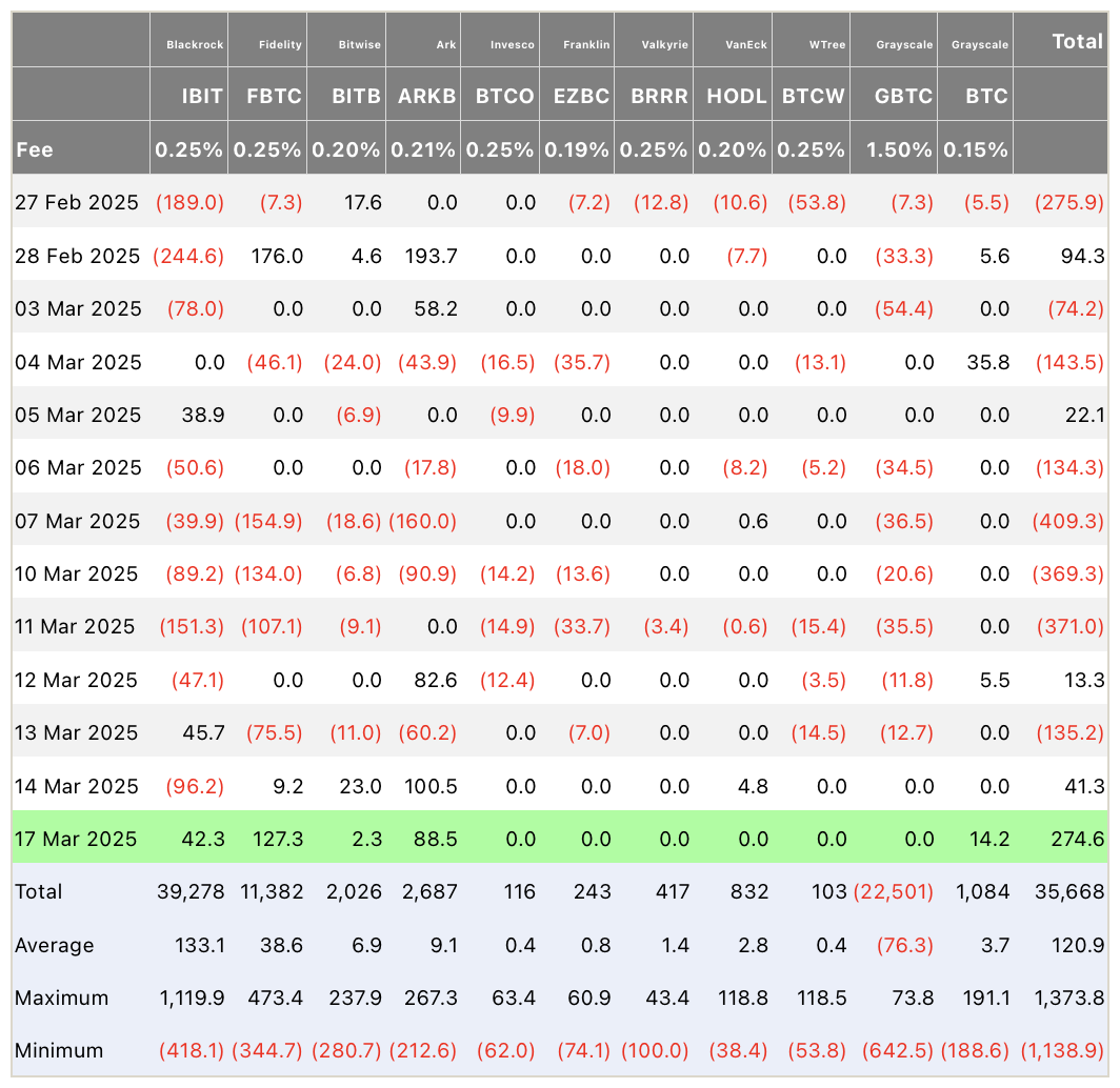 Американские биржевые фонды, торгующие спотовым биткоином, зафиксировали чистый приток капитала в размере $274,6 млн 17 марта, что стало крупнейшим показателем за последние шесть недель с 4 февраля.