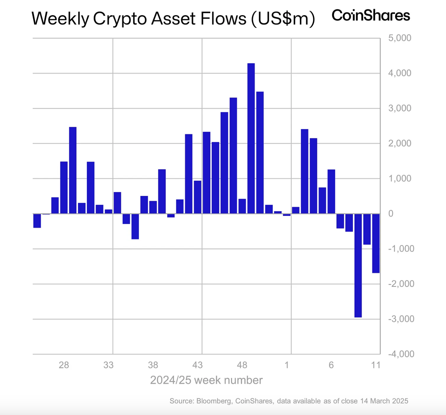 На прошлой неделе — с 10 по 14 марта — инвестиционные продукты на базе криптовалют потеряли $1,7 млрд