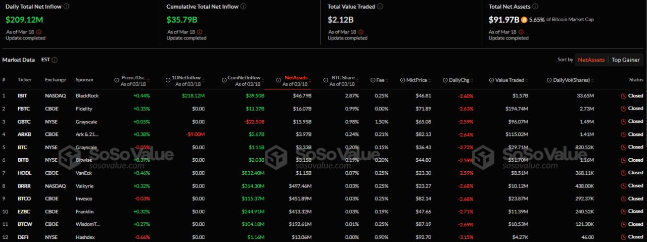 - 18 марта спотовые биткоин- и Ethereum-ETF отметились разной динамикой.