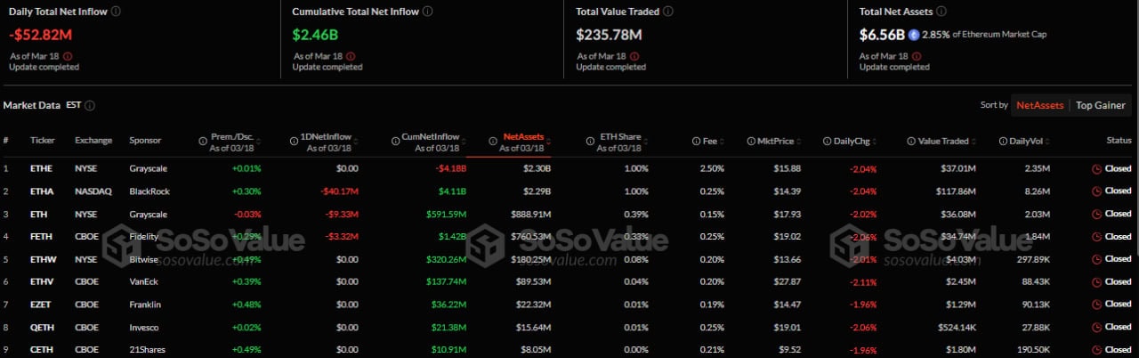 - Ethereum-ETF зафиксировали отток на $52,82 млн.