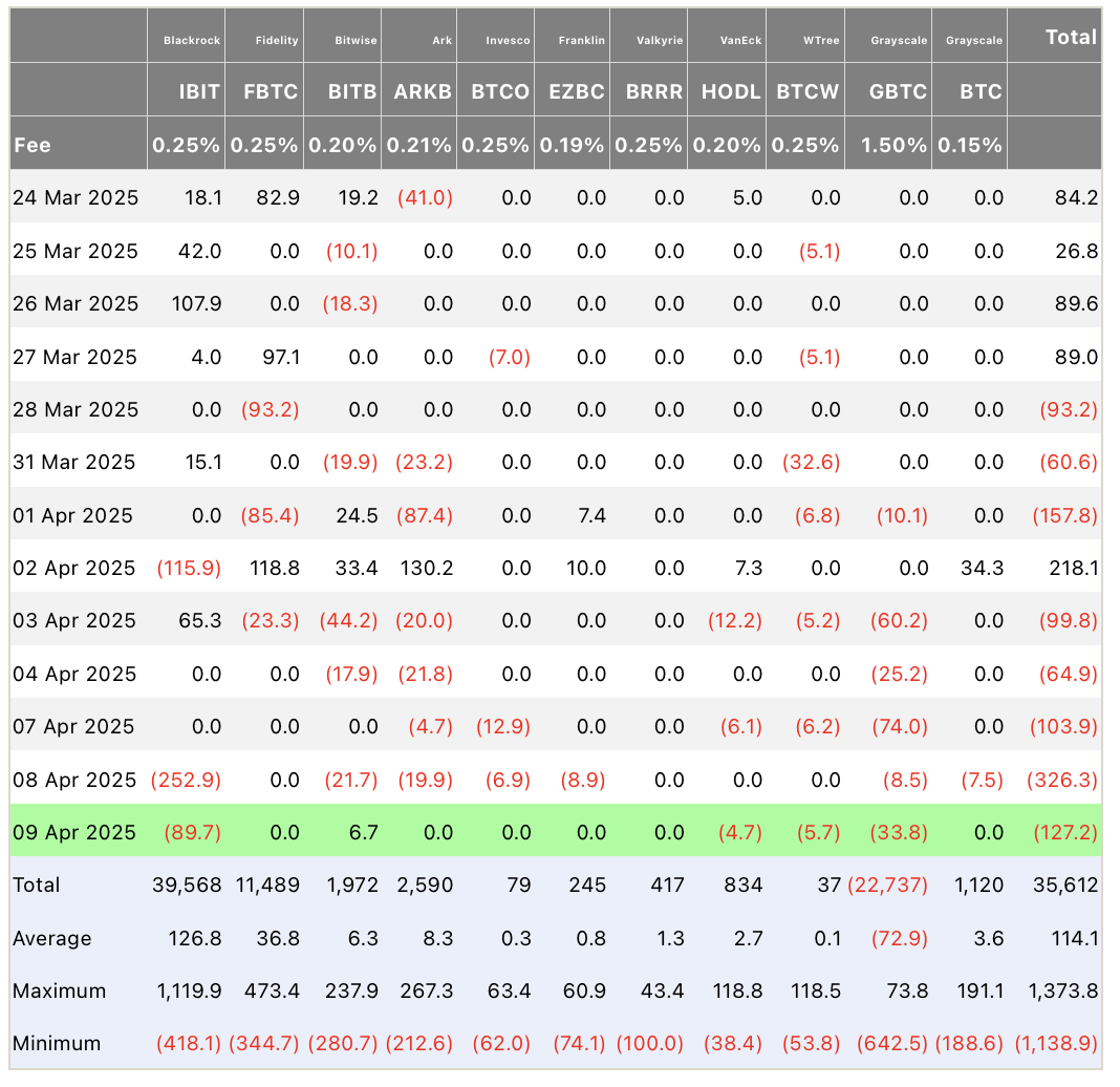 Несмотря на вчерашний рост рынка, спровоцированный решением президента США Дональда Трампа (Donald Trump) приостановить введение новых тарифов на 90 дней, американские спотовые биткоин-ETF зафиксировали чистый отток средств в размере $127,12 млн.