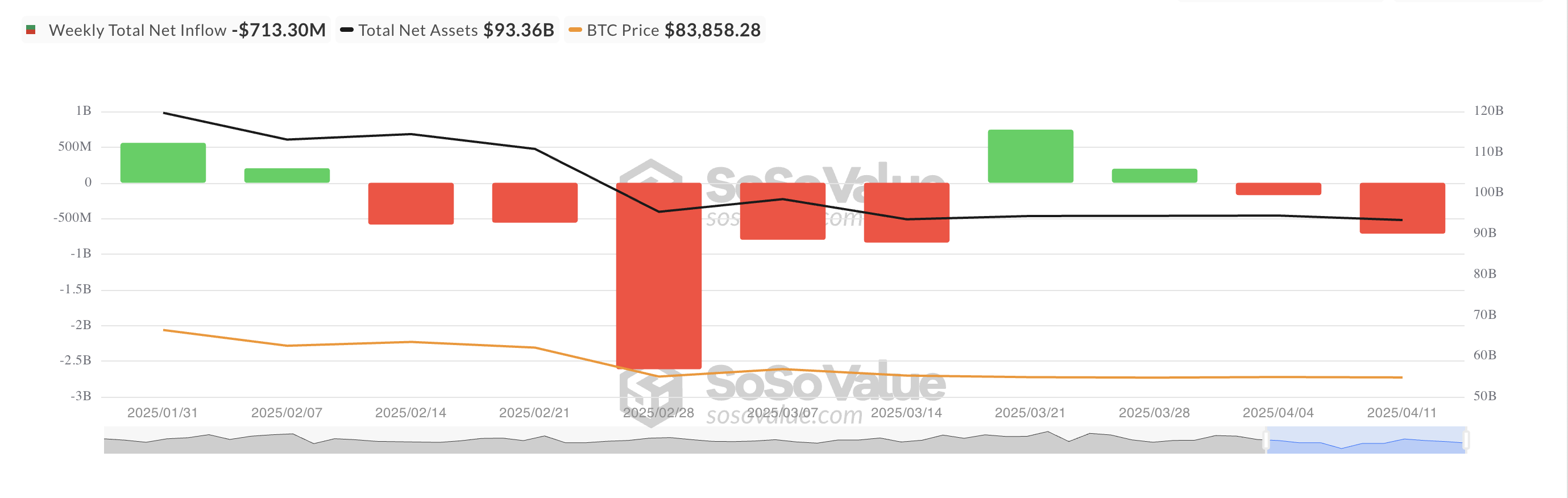 На прошлой неделе спотовые биржевые фонды (ETF) на биткоин (BTC) столкнулись с чистым оттоком средств в $713 млн, что более чем в три раза превышает показатель предыдущей недели в $172,69 млн