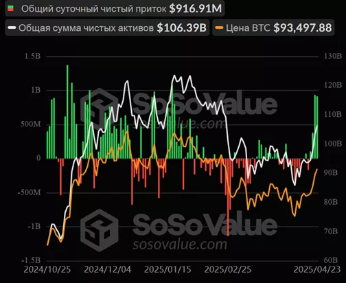23 апреля инвесторы направили в спотовые ETF на основе цифрового золота $916,9 млн, за последние четыре дня — $2,342 млрд.