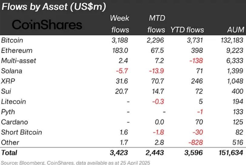- В период с 21 по 25 апреля в криптопродукты поступило $3,4 млрд.