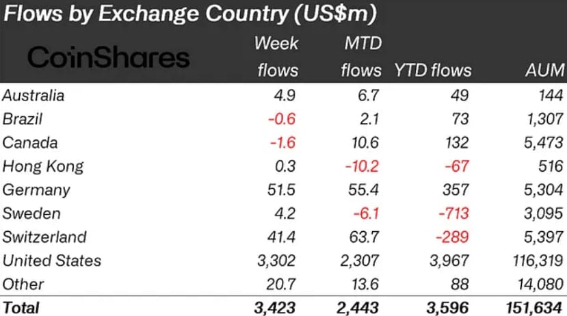 Основную часть притока обеспечили инвесторы из США, которые вложили $3,3 млрд. В то же время положительная динамика наблюдалась и в других странах, в частности в Германии, где приток составил $51,5 млн, а также в Швейцарии — $41,4 млн.