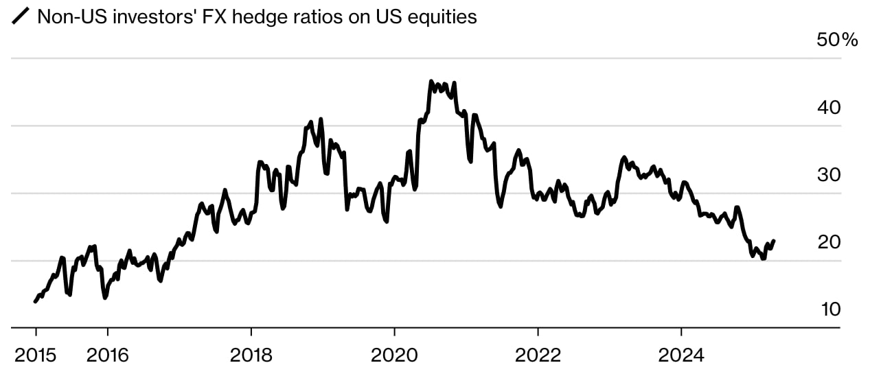 Хеджирование валютных рисков, которое казалось неважным в годы роста США, внезапно стало критически важным. По данным Morgan Stanley и Bank of America, спрос на хеджирование резко вырос. По данным State Street, сейчас валютно-хеджированных активов у иностранцев всего 23%, против почти 50% в 2020 году.