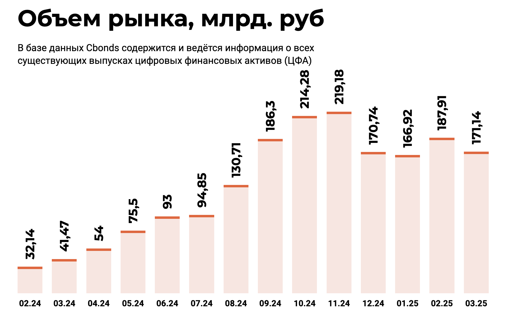 По данным Cbonds, по состоянию на март 2025 года объем рынка цифровых финансовых активов составлял 171 млрд рублей. Всего за год показатель увеличился на 317%. Это говорит о том, что интерес к новому инструменту растет. Некоторые предсказывают, что к концу этого года капитализация этого сектора достигнет 1 трлн рублей.