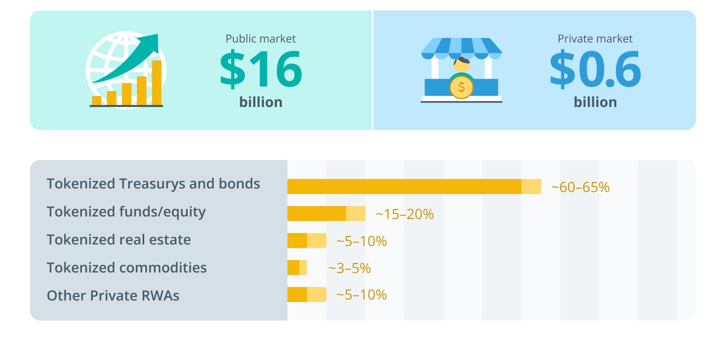 По оценке команды Stobox, основную часть рынка RWA сегодня всё же составляют казначейские бумаги и облигации, от 60 до 65%.