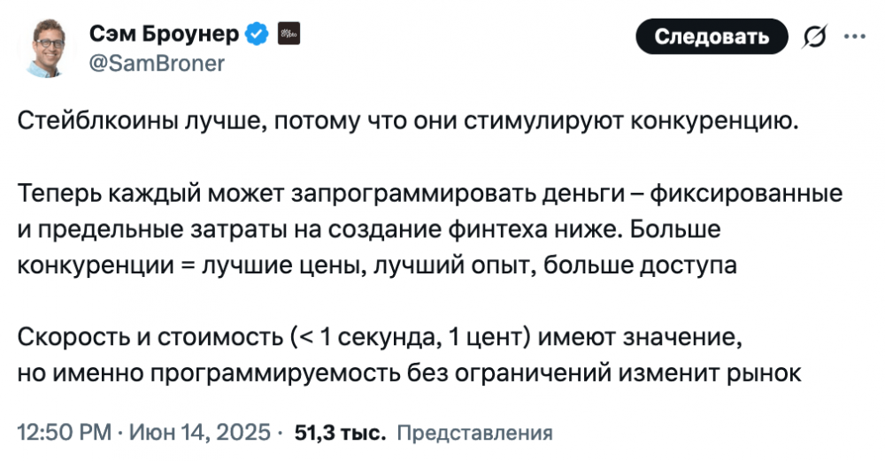 Дарен Мацуока, аналитик a16z Crypto, также высказался о будущем стейблкоинов. В сообщении X от 6 июня он заявил: